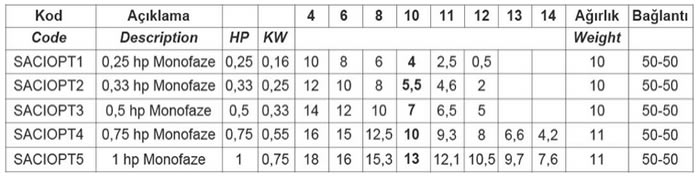 Motor Özellikleri : Standart eşzamansız motor, IP 55 koruma, 2,850 rpm, 50-60 Hz, F sınıf yalıtım.